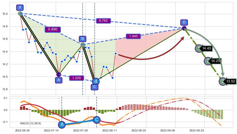 ➣ D点拟合预测价格14.77,距离最后交易收盘价格14.35相差 +2.94%
