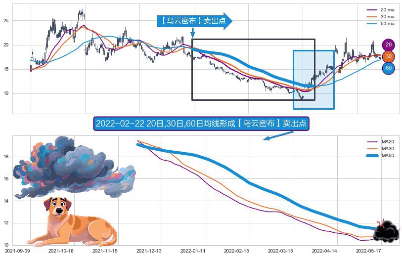 ⚀ 2021-11-26日-2022-05-17日显现 20日-30日-60日均线 【乌云密布】卖出点 看空信号,后市看跌,卖出