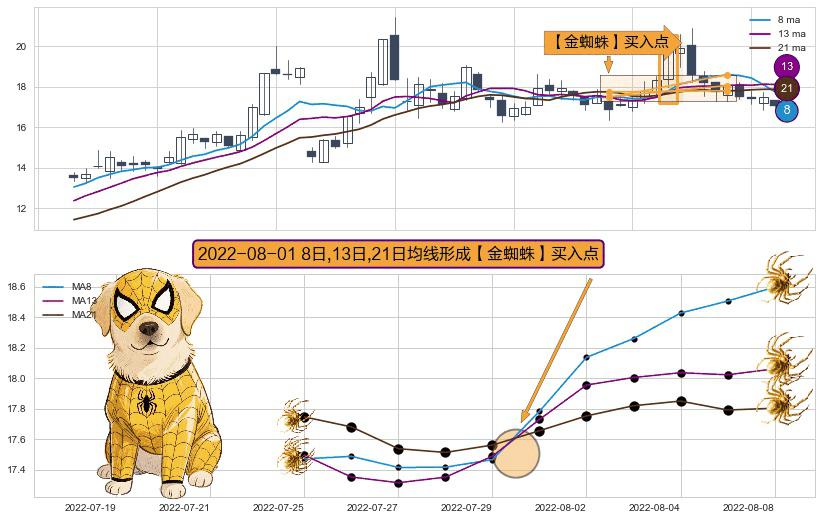 ⚀ 2022-08-01日显现 8日-13日-21日均线 【金蜘蛛】买入点 看多信号,后市看涨,买入