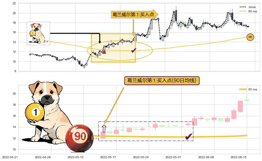 ⚀ 2022-05-13-日显现 葛兰威尔均线 90日均线 第买①入点 走势反转见底信号,后市看涨,买进信号