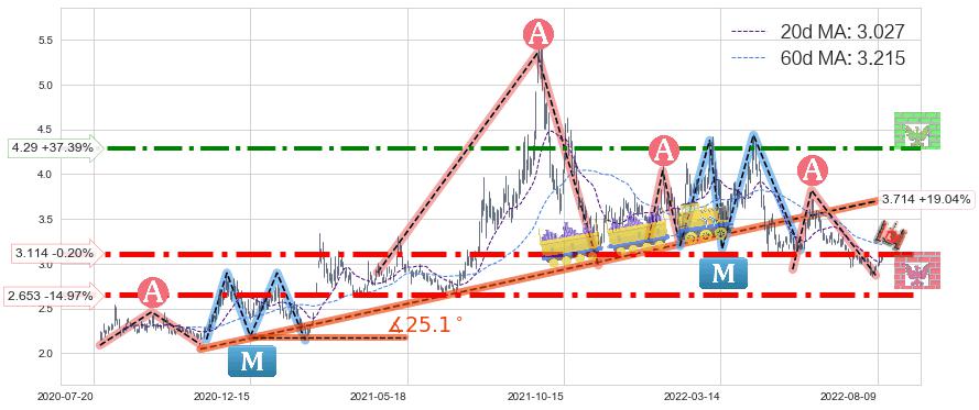 ♘ 支撑价格位2.653,可信任强度93.57%,距离最后交易2022-08-12形成的收盘价格3.120相差 -14.97%
