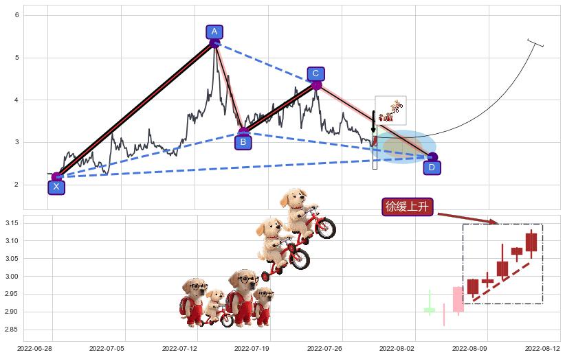 | 2 🅚:【高山滑雪】买入点 ➕ 📡:谐波伽利临近d点:猜想c下行到达d点后报复性拉升上涨(均值回复) ☞ 看多信号 ⇥ 【均线】交织【图形】⇥ 综合量化分数: 52 | > |