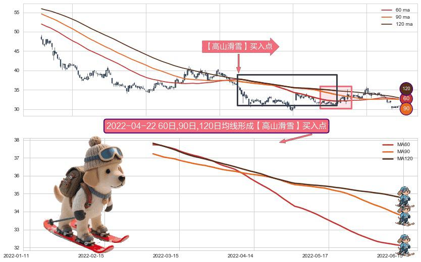 ⚀ 2022-03-04日-2022-06-14日显现 60日-90日-120日均线 【高山滑雪】买入点 看多信号,后市看涨,买入