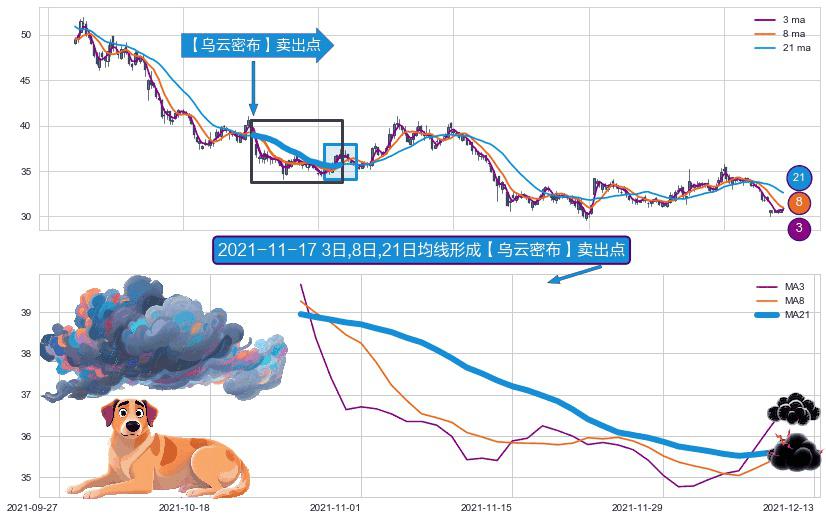 ⚀ 2021-10-26日-2021-12-09日显现 3日-8日-21日均线 【乌云密布】卖出点 看空信号,后市看跌,卖出