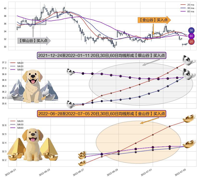 ⚃ 2022-06-29-日至2022-07-05-日显现 20日-30日-60日均线 【金山谷】买入点 其再次确认了买入信号,可靠性更强,买入