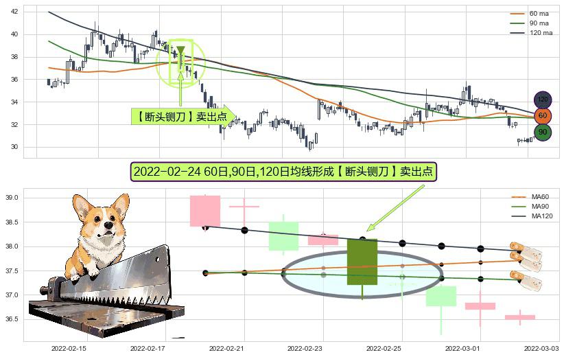 ⚀ 2022-02-24日显现 60日-90日-120日均线 【断头铡刀】卖出点 看空信号,后市看跌,卖出