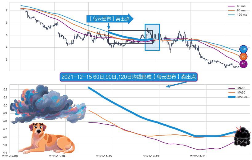 形态多维评估: ⚀ 2021-11-01日-2022-02-07日显现 60日-90日-120日均线 【乌云密布】卖出点 看空信号,后市看跌,卖出