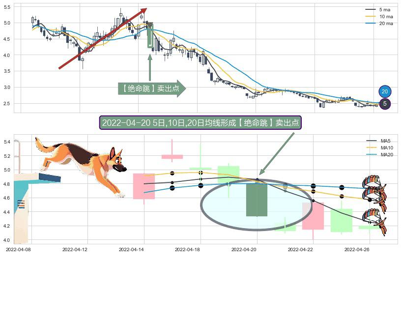 形态多维评估: ⚀ 2022-04-20日显现 5日-10日-20日均线 【绝命跳】卖出点 看空信号,后市看跌,卖出