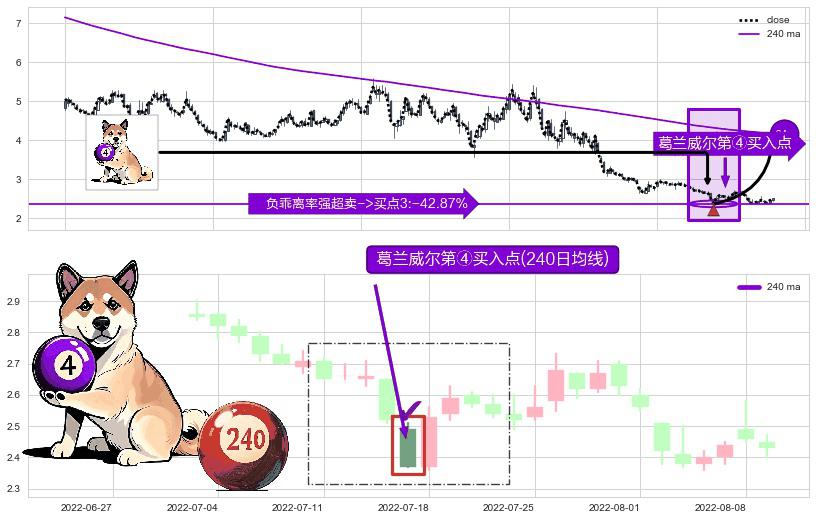 形态多维评估: ⚀ 2022-07-15-日显现 葛兰威尔均线 240日均线 第④买入点 下降趋势均值回复的短线反弹信号,后市看涨,买进信号