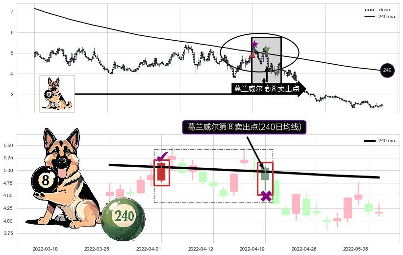 形态多维评估: ⚀ 2022-04-19-日显现 葛兰威尔均线 240日均线 第⑧卖出点 下降趋势的中继信号,后市看跌,卖出信号