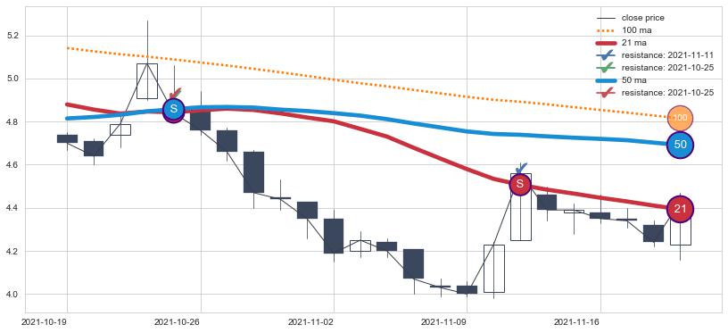 下跌趋势2021-10-19-2021-11-19,均线50, 21确认关键阻力2处