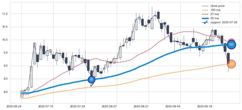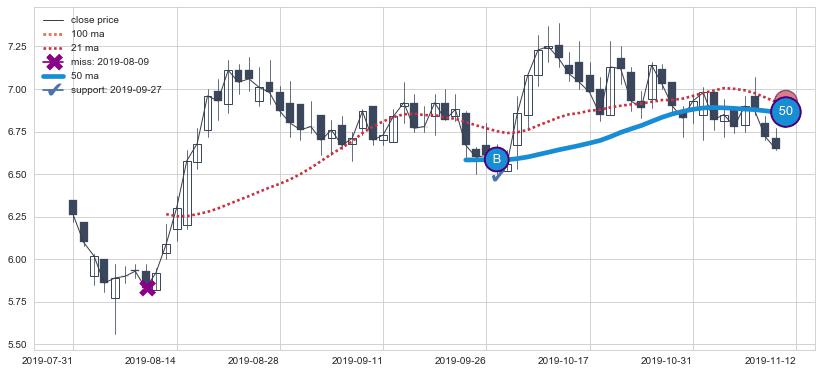 上涨趋势2021-12-03-2022-01-27,均线50, 21确认关键支撑3处