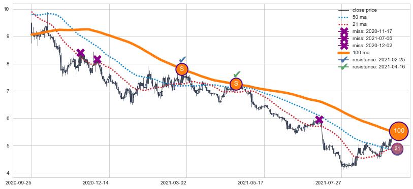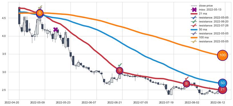 下跌趋势2022-04-20-2022-08-12,均线50, 100, 21确认关键阻力3处