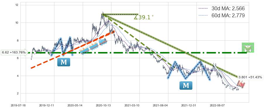 ♘ 阻力价格位6.62,可信任强度92.28%,距离最后交易2022-08-12形成的收盘价格2.510相差 +163.76%