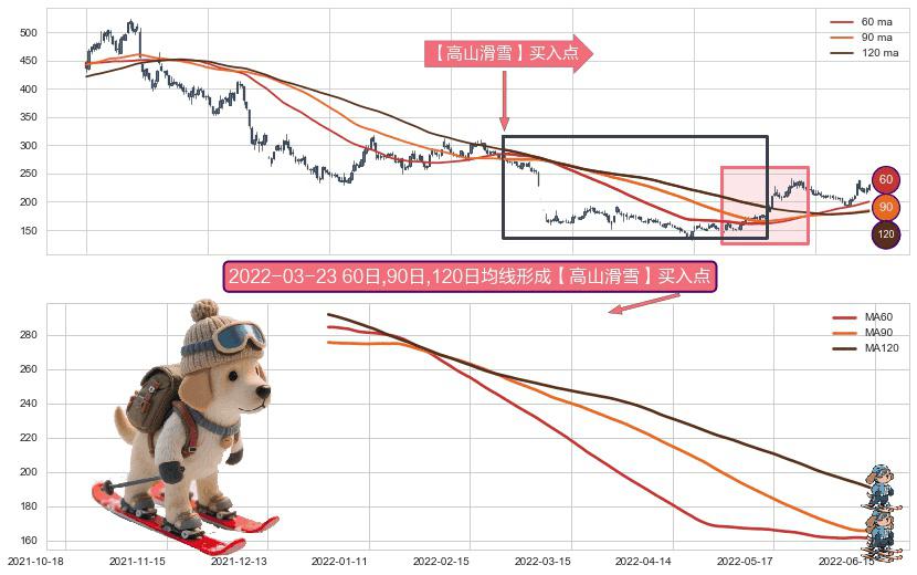 形态多维评估: ⚀ 2021-12-29日-2022-06-14日显现 60日-90日-120日均线 【高山滑雪】买入点 看多信号,后市看涨,买入
