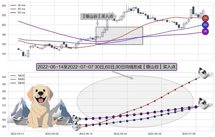 形态多维评估: ⚀ 2022-06-15-日至2022-07-07-日显现 30日-60日-90日均线 【银山谷】买入点 看多信号,后市看涨,买入