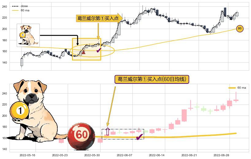 形态多维评估: ⚀ 2022-05-31-日显现 葛兰威尔均线 60日均线 第买①入点 走势反转见底信号,后市看涨,买进信号