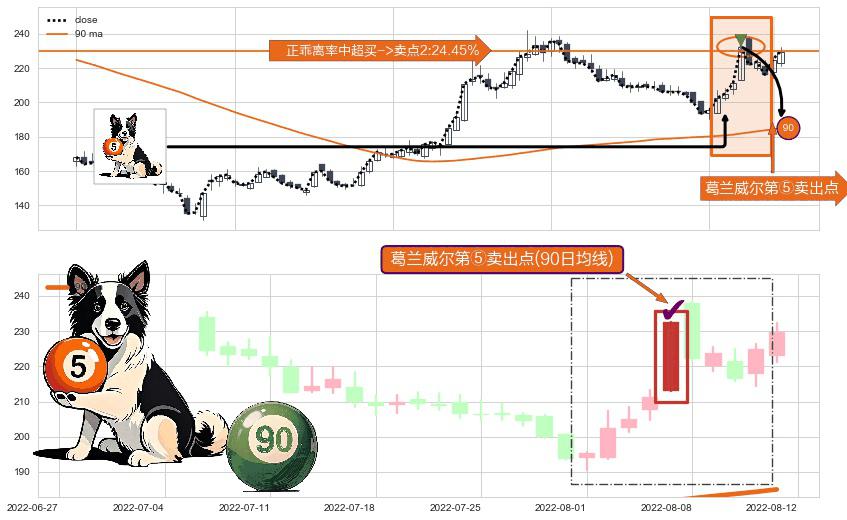 形态多维评估: ⚀ 2022-08-05-日显现 葛兰威尔均线 90日均线 第⑤卖出点 上升趋势均值回复的短线回落信号,后市看跌,卖出信号