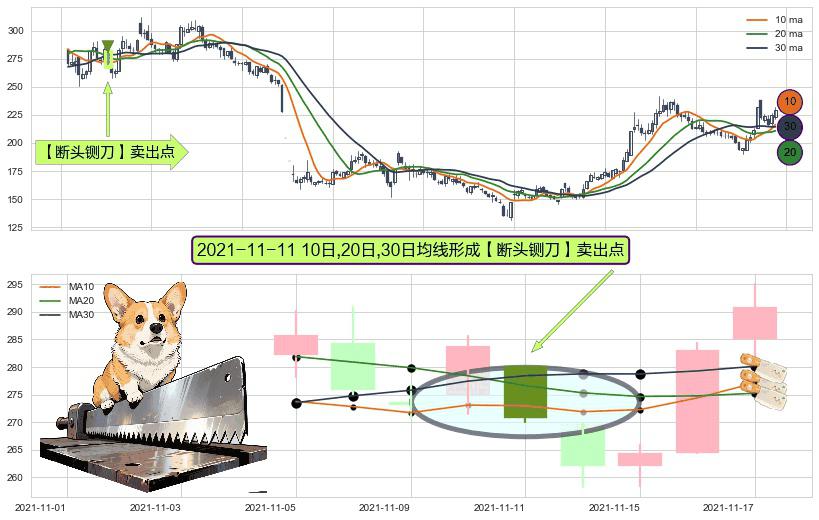 形态多维评估: ⚀ 2021-11-11日显现 10日-20日-30日均线 【断头铡刀】卖出点 看空信号,后市看跌,卖出