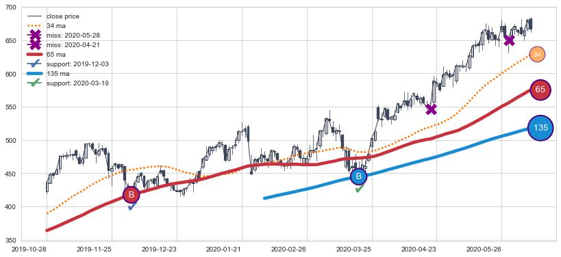 上涨趋势2019-10-28-2020-06-08,均线65, 135确认关键支撑2处