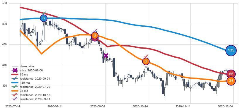 下跌趋势2020-07-14-2020-12-04,均线65, 34, 135确认关键阻力3处