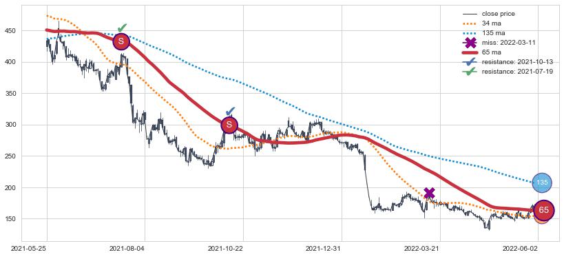下跌趋势2021-05-25-2022-06-02,均线65确认关键阻力2处
