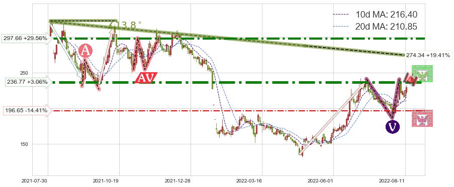 ♘ 阻力价格位236.77,可信任强度90.69%,距离最后交易2022-08-12形成的收盘价格229.75相差 +3.06%