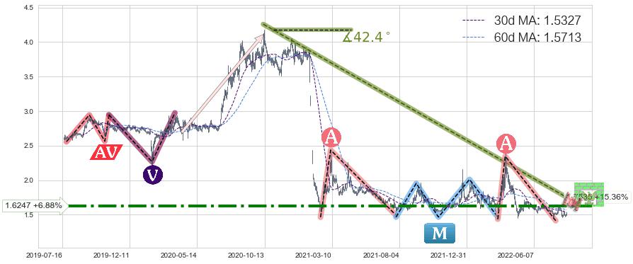 从2020-10-09至2022-08-11,共包含450个交易日,阶段股价下跌-83.87%,阶段股价变动位移路程比: 1 : 9,下跌趋势角度: 42.4
