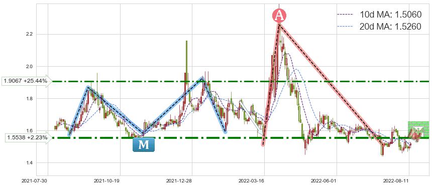 ♘ 阻力价格位1.9067,可信任强度67.92%,距离最后交易2022-08-12形成的收盘价格1.5200相差 +25.44%