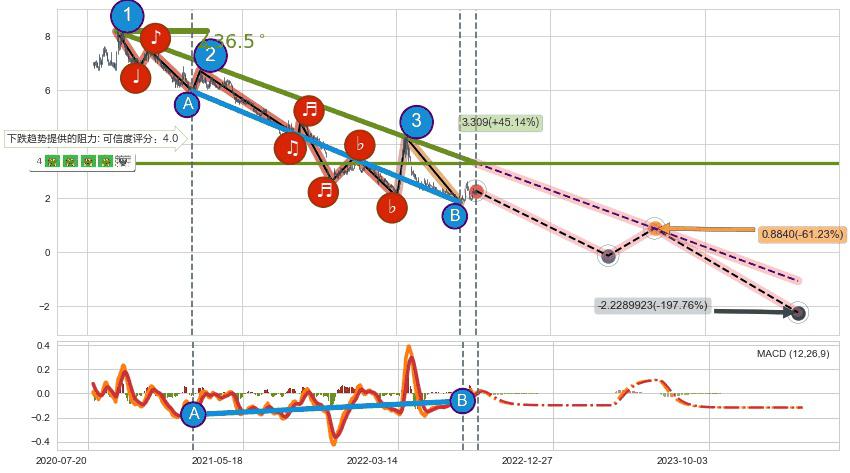 ♘ 在最后的下跌阶段2020-09-10至2022-07-27,存在 持续未破位的阻力位 ,阻力价格3.309,可信任强度85.36%,其距离最后价格2.280相差 +45.14%