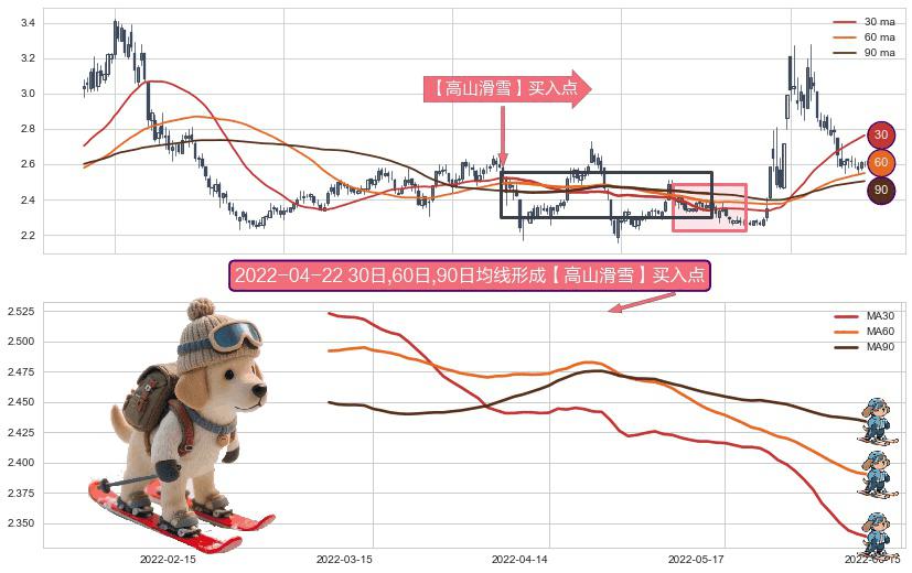 形态多维评估: ⚀ 2022-03-08日-2022-06-09日显现 30日-60日-90日均线 【高山滑雪】买入点 看多信号,后市看涨,买入