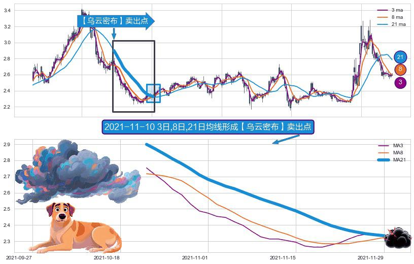 形态多维评估: ⚀ 2021-10-21日-2021-11-30日显现 3日-8日-21日均线 【乌云密布】卖出点 看空信号,后市看跌,卖出