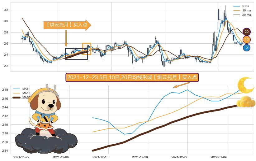 形态多维评估: ⚀ 2021-12-09日-2022-01-06日显现 5日-10日-20日均线 【烘云托月】买入点 看多信号,后市看涨,买入