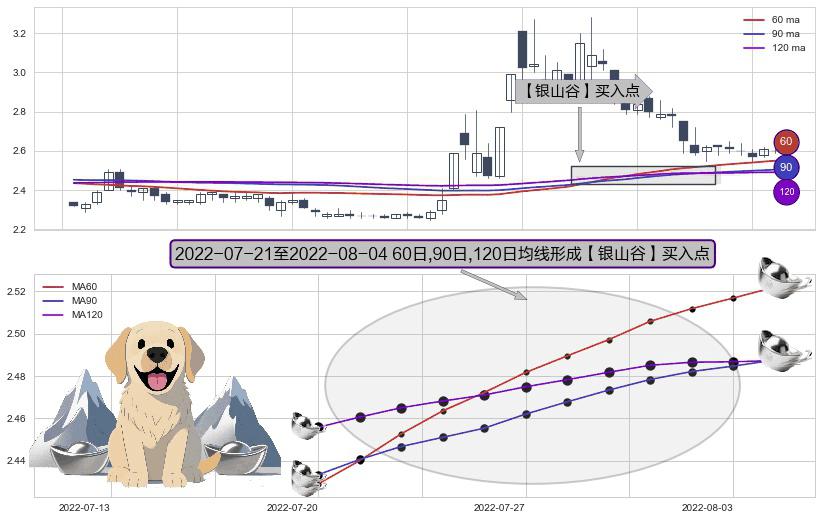形态多维评估: ⚀ 2022-07-22-日至2022-08-04-日显现 60日-90日-120日均线 【银山谷】买入点 看多信号,后市看涨,买入