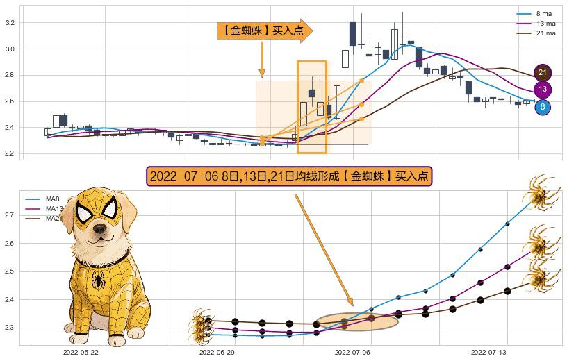 形态多维评估: ⚀ 2022-07-06日显现 8日-13日-21日均线 【金蜘蛛】买入点 看多信号,后市看涨,买入