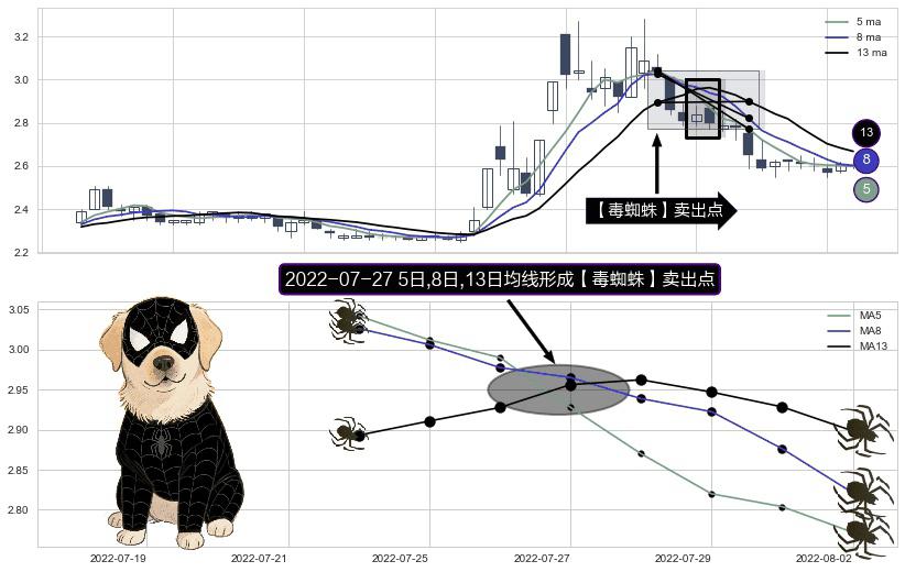 形态多维评估: ⚀ 2022-07-27日显现 5日-8日-13日均线 【毒蜘蛛】卖出点 看空信号,后市看跌,卖出