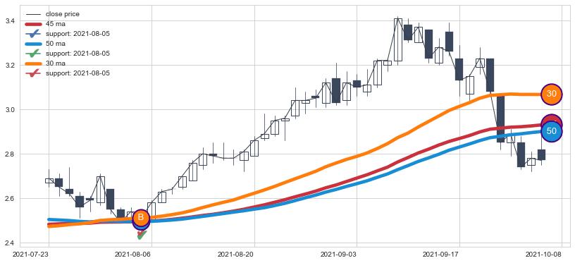 上涨趋势2021-07-23-2021-10-08,均线50, 45, 30确认关键支撑1处