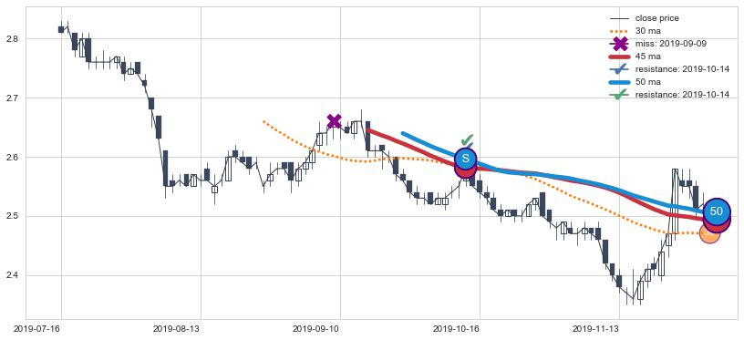 下跌趋势2019-07-16-2019-11-29,均线50, 45确认关键阻力1处