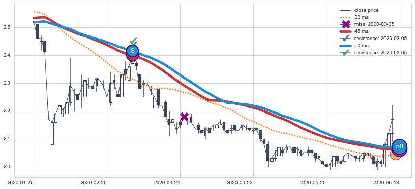 下跌趋势2020-01-20-2020-06-18,均线50, 45确认关键阻力1处