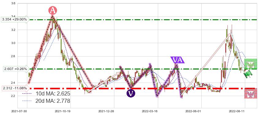 ♘ 支撑价格位2.312,可信任强度91.49%,距离最后交易2022-08-12形成的收盘价格2.600相差 -11.08%