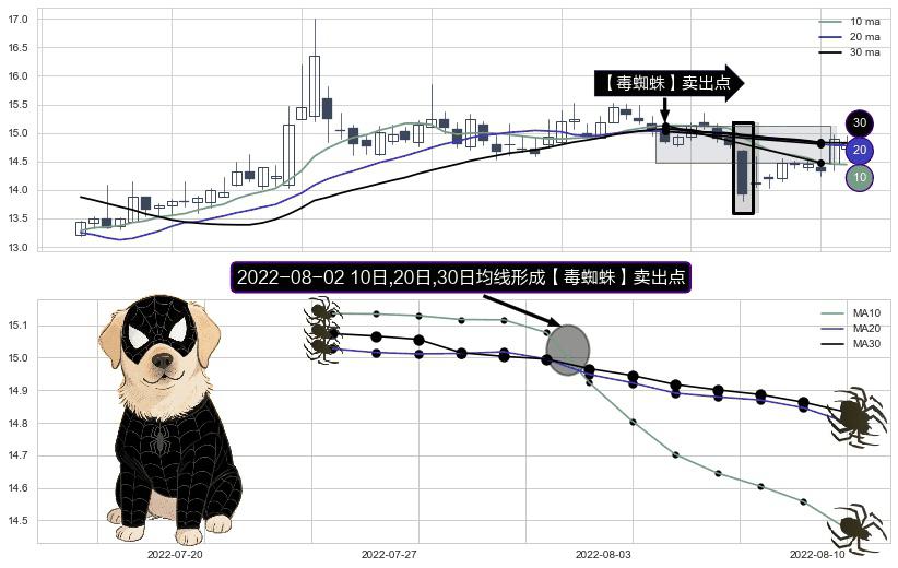 ⚀ 2022-08-02日显现 10日-20日-30日均线 【毒蜘蛛】卖出点 看空信号,后市看跌,卖出