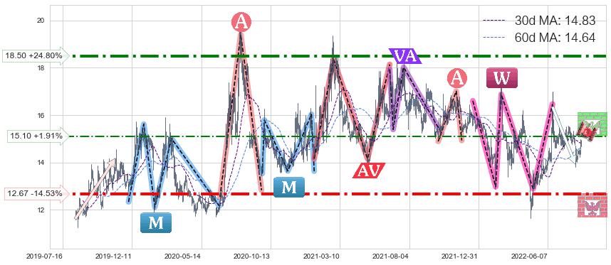 ♘ 阻力价格位15.10,可信任强度52.54%,距离最后交易2022-08-12形成的收盘价格14.82相差 +1.91%