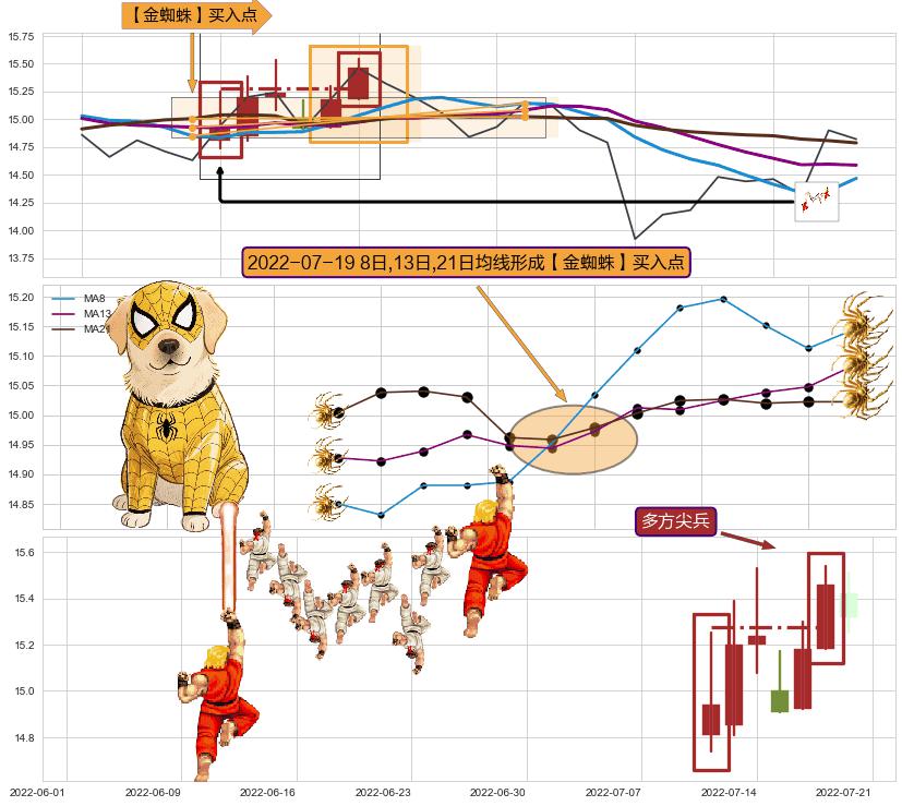 | 3 🅚:【蛟龙出海】买入点 ➕ 📡:谐波伽利已到达d点:猜想c下行到达d点后报复性拉升上涨(均值回复) ☞ 看多信号 ⇥ 【均线】交织【图形】⇥ 综合量化分数: 52 | > |
