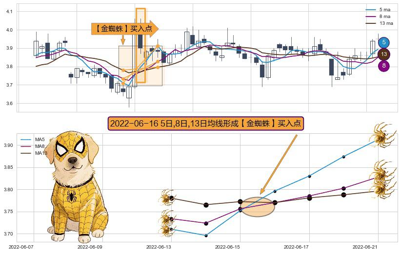 ⚀ 2022-06-16日显现 5日-8日-13日均线 【金蜘蛛】买入点 看多信号,后市看涨,买入