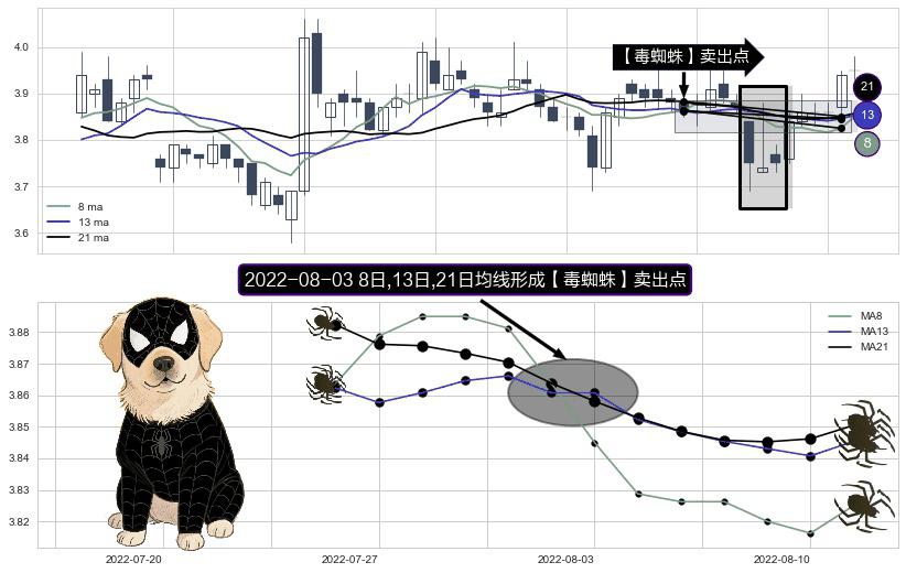 ⚀ 2022-08-03日显现 8日-13日-21日均线 【毒蜘蛛】卖出点 看空信号,后市看跌,卖出