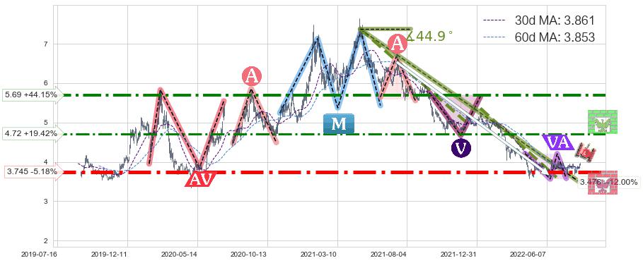 ♘ 阻力价格位4.72,可信任强度68.29%,距离最后交易2022-08-12形成的收盘价格3.950相差 +19.42%