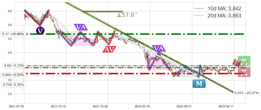♘ 阻力价格位4.02,可信任强度51.03%,距离最后交易2022-08-12形成的收盘价格3.950相差 +1.73%