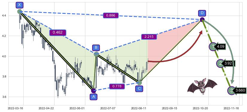 ➣ 未完成【蝙蝠】形态起点X: 2022-03-11, 已到达C点: 2022-08-03, 预测最终D点: 2022-10-13, 共149交易日