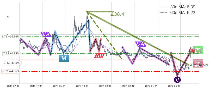 ♘ 支撑价格位7.13,可信任强度50.98%,距离最后交易2022-08-12形成的收盘价格7.76相差 -8.12%