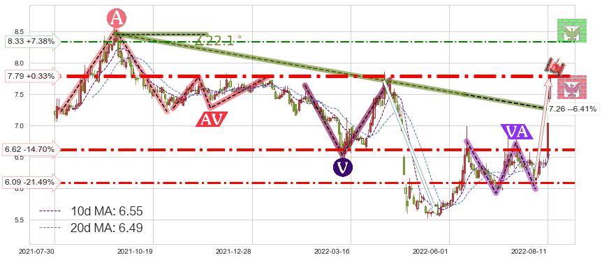 ♘ 支撑价格位6.62,可信任强度79.28%,距离最后交易2022-08-12形成的收盘价格7.76相差 -14.70%